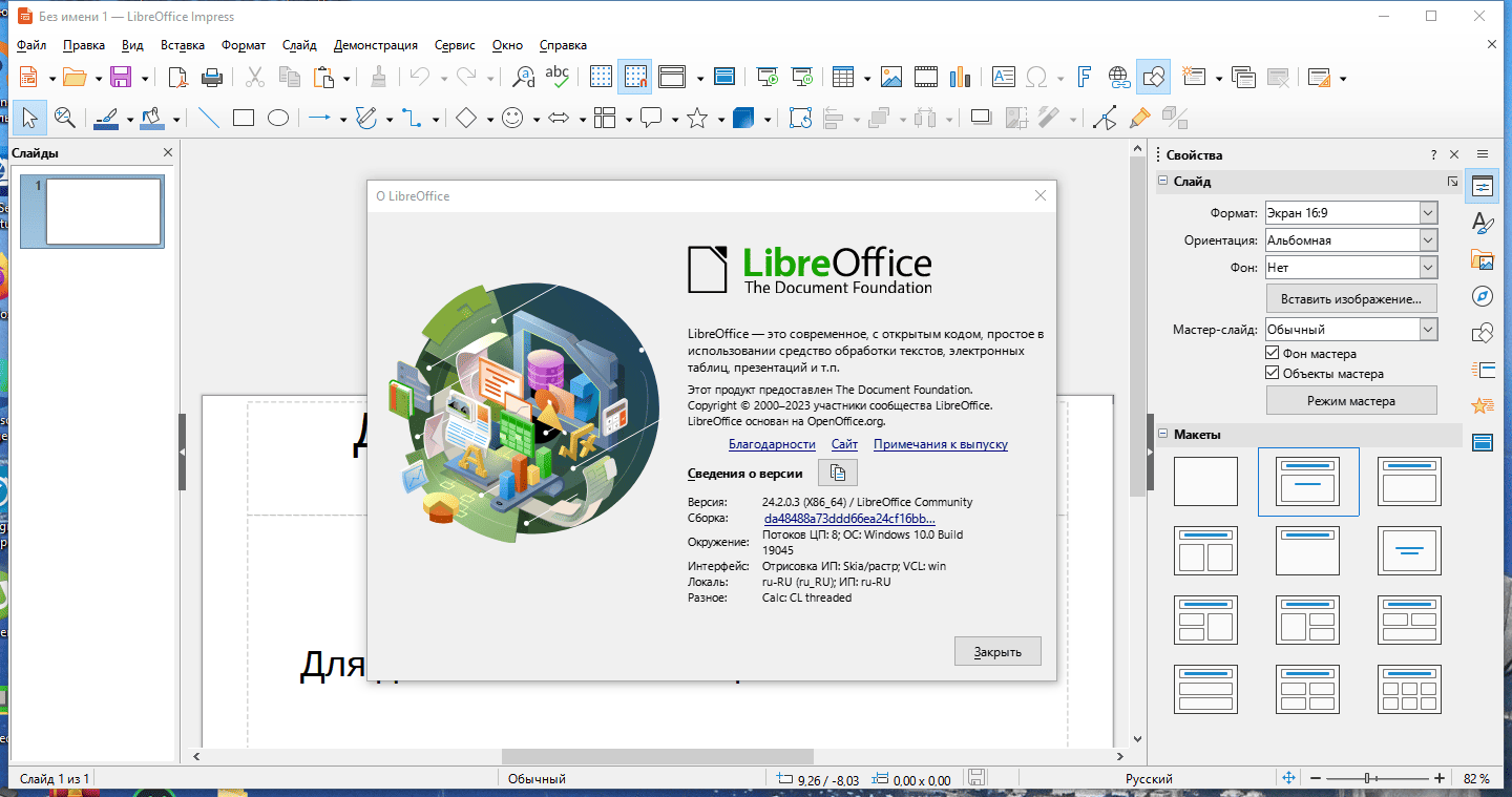 О программе: LibreOffice - офисный пакет с открытым исходным кодом, являющийся ответвлением от проекта OpenOffice.org и претендующий на роль бесплатной альтернативы пакету офисных приложений Microsoft Office. В состав программы входят текстовый редактор Writer, табличный процессор Calc, мастер презентаций Impress, векторный графический редактор Draw, редактор формул Math и модуль управления базами данных Base. Кроме того LibreOffice оснащен средствами импортирования SVG-графики и созданных в Microsoft Works и Lotus Word Pro файлов. Также в состав пакета включены многие расширения, как например импорт PDF, консоль презентаций, улучшенный построитель отчётов и многое другое.